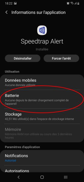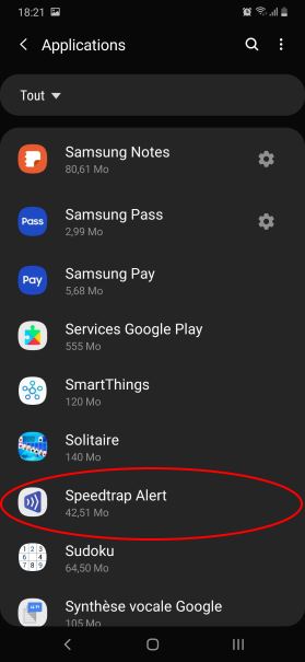 Allez dans les paramètres du téléphone dans Applications. Ouvrez la page de "Speedtrap Alert":