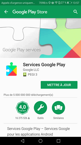 Il faut mettre à jour Services Google Play sur votre téléphone. Allez dans les paramètres de votre appareil, puis sélectionnez Applications. Dans la liste sélectionnez "Services Google Play" ou "Google Play Services". Puis dans la page d'information de l'application, appuyez sur "Détails de l'application". Si rien ne s'affiche, cliquez sur ce lien: https://play.google.com/store/apps/details?id=com.google.android.gms&hl=fr :