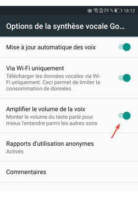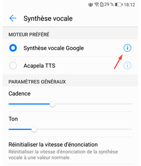 - Si la synthèse vocale reste trop faible, ouvrez les paramètres de le Synthèse Vocale Google. Généralement, celle-ci se trouve dans les paramètres de votre téléphone - Langues & Saisie - Synthèse vocale ou depuis le menu Accessibilité.