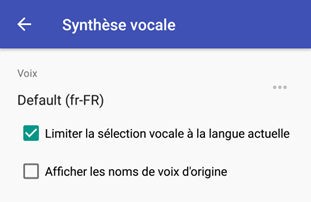 Appuyez sur le menu d'options en haut à droite pour sélectionner une nouvelle voix. Il faut décocher "Limiter la sélection vocale à la langue actuelle" si vous voulez charger une voix de langue étrangère.