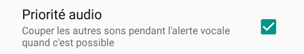 Activée, cette fonctionnalité coupera les autres sons de votre téléphone pendant une alerte vocale pour mieux écouter la voix d'alerte. Toutefois cette possibilité peut-être restreinte par le système de votre téléphone.