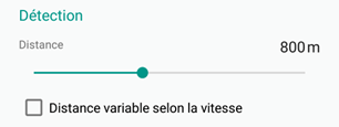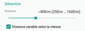 En choisissant de désactiver l'option, toutes les détections démarreront à la valeur indiquée (800m dans l'exemple) quelque soit la vitesse à laquelle vous roulez.