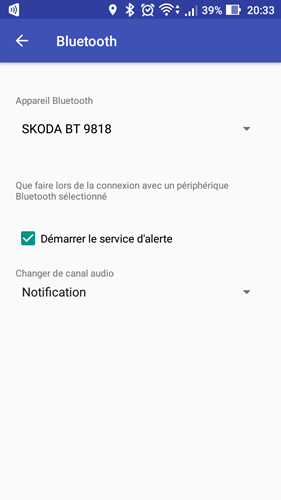 Changer de canal audio permet de spécifier le canal audio à utiliser lorsque le téléphone se connecte à un appareil sélectionné dans Appareil Bluetooth. Quand cette option est-elle utile? Supposons que votre autoradio autorise la connexion Bluetooth, prend en charge le profil A2DP et que votre téléphone se connecte à l'autoradio. Dans ce cas, le système Android achemine le canal multimédia par défaut utilisé par l'application vers l'autoradio en contournant le haut-parleur du téléphone. Si vous écoutez FM/CD/MP3 et ne diffusez pas d'audio via Bluetooth, vous n'entendrez rien d'un téléphone avec un canal multimédia sélectionné. La sélection d'un canal différent permet d'activer le haut-parleur du téléphone. Le canal à choisir (Alarme ou Notification) dépend du téléphone et du modèle audio de la voiture. Cependant, même si vous avez sélectionné un canal autre que multimédia, mais que votre téléphone joue de la musique en cours de connexion, le système Android acheminera également les sons de l'application vers l'audio de la voiture.
