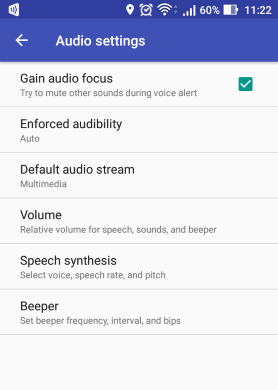 Gain audio focus - when this option enabled, the app reduces the volume of other sounds being played by a phone (music, podcast). This works only for voice. Alert sounds and beeper are mixed with other sounds.