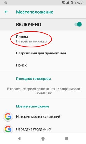 Убедитесь, что местоположение включено. Для работы приложения требуется точное местоположение, включите режим "По всем источникам" (GPS, Wi-Fi, мобильные сети) или режим "По спутникам GPS". Не включайте режим "По координатам сети".