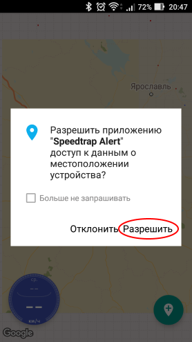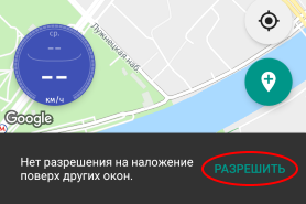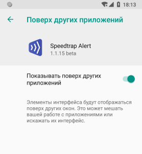 Для показа визуальных предупреждений, а также плавающего спидометра, приложение использует всплывающие окна. Данная возможность Андроид требует специального разрешения, обычно оно называется "разрешить наложение поверх других окон". При самом первом запуске приложение запрашивает это разрешение.