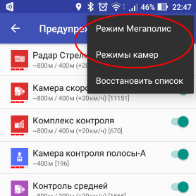 Ездящим в Москве настоятельно рекомендуется попробовать функции "Режим Мегаполис" и "Режимы камер". По умолчанию обе функции выключены. Для этого зайти в настройки приложения и выбрать пункт "Предупреждения".