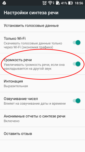 Если синтезатор Google установлен, громкость в телефоне достаточна, но голос звучит слабо, убедитесь, что в настройках синтезатора включен переключатель "Громкость речи"
