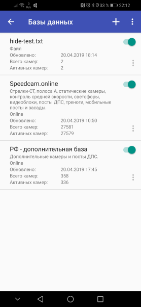 На скриншоте, приведенном ниже, 2 точки из базы hide-test.txt замещают 2 точки из базы speedcam.online (всего 27581, активно 27579). А база speedcam.online, в свою очередь, замещает 22 точки из базы "РФ-дополнительная".