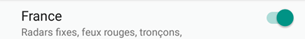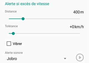 Exemple avec distance=400m et tolérance=+2km/h: vous roulez sur une route limitée à 70 km/h et êtes à 350m en amont d'un radar ou d'une zone, vous entendrez l'alerte sonore si vous roulez au-dessus de 72km/h.
