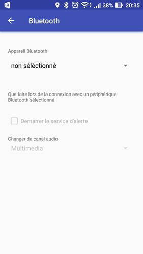 Appareil Bluetooth affiche dans une liste déroulante les appareils Bluetooth associés à votre téléphone ou à votre tablette. Il ne sont pas connectés à ce moment, seulement jumelés. Vous pouvez sélectionner un périphérique et les options ci-dessous spécifient les actions à effectuer lorsque votre téléphone ou votre tablette se connecte à cet appareil:
