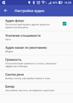 Аудио фокус - когда отмечено, приложение просит Андроид приглушить громкость остальных звуков, воспроизводимых телефоном (музыка, подкасты), на время озвучивания голосового предупреждения. Тревожные звуки и бипер аудио фокус не запрашивают и микшируются с остальными звуками.