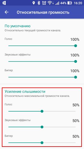 Усиление слышимости - имеет три значения: выключить, включить, авто.